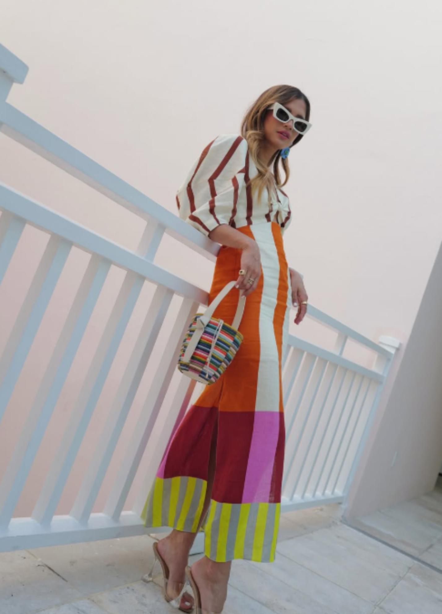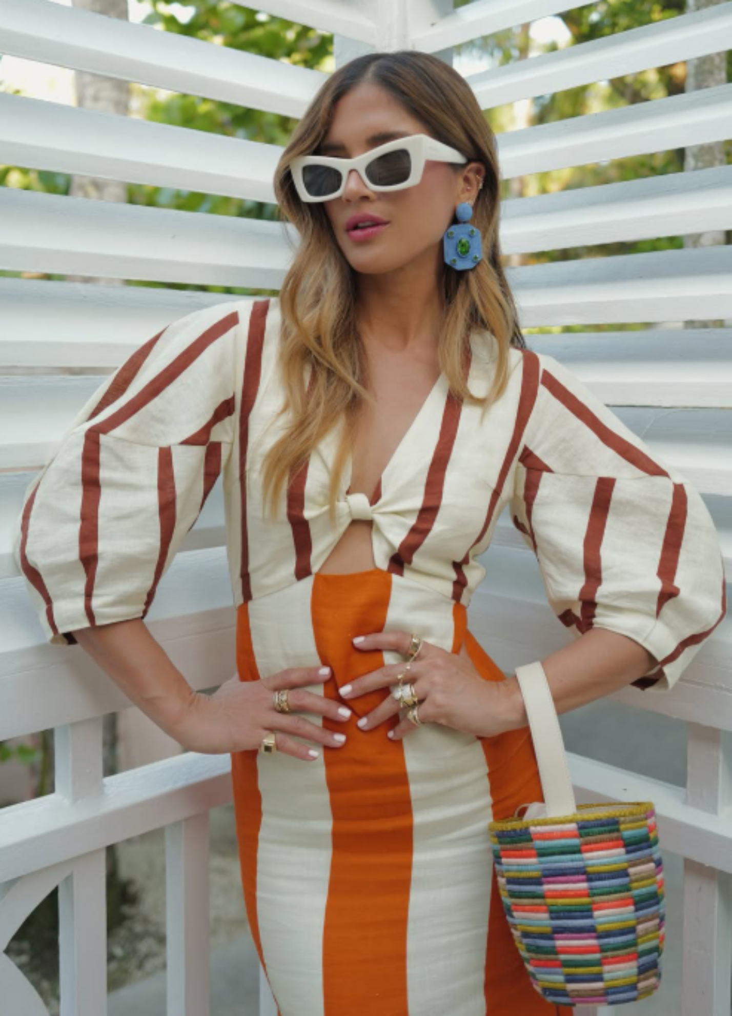 Un abito estivo dal design sofisticato e d’effetto, perfetto per una vacanza elegante o una giornata speciale.